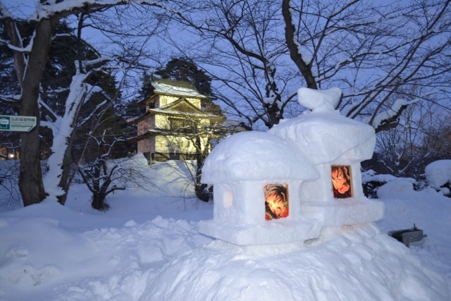 青森県弘前市にある弘前城(弘前公園)を舞台に、毎年2月上旬に開催される「弘前城雪燈籠まつり」。